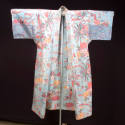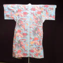 DescriptionResist dye; light blue back-ground, floral and animal designs, multicolored. Sleeve gusset, long collar=Okinawa Ryukyuan construction. Mostly large pattern stencil with some patches of small pattern on the front of the sleeves.ca. 1940
