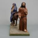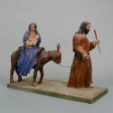 DescriptionJoseph is leading a brown burro by a leather thong in his right hand. He is dressed in a red tunic and black belt. In his left hand he holds a red stick with black bands. Mary, riding side saddle on the burro, is dressed in blue and holds the baby Jesus in her arms. The base is a green rectangle. Unsigned.