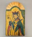 DescriptionThe black-bearded saint is depicted with a red-lined green cloak over a yellow undergarment with black sleeves, and wearing a biretta. In his right hand is a cross and in his left a palm leaf. A green drape hangs behind him, and a green ruffle runs above him. An unpainted, carved lunette forms the top. Handwritten title and signature on back, but not in artist's writing.