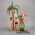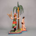 DescriptionAdam and Eve are holding hands as they walk from the Garden of Eden at the front of the bulto. Adam has black hair and beard and is only wearing a brown loincloth with a gold lining. In his right hand is a red apple with two bites taken out of it. Eve has brown hair and is wearing only a blue loincloth with a gold lining and has an upturned left foot. Towering directly behind them is a brown palm tree with ten green and black palm fronds. Also behind them and to the left is an angel whose upraised right hand holds a green and gold sword and his left hand points out of the garden. He wears a helmet in red and gold with black inserts with white flower and feather decoration. The helmet also has a red plume attached to the back and curving forward. He wears a three tiered outfit. At the top is a chest protector in green with gold and red decoration. Below that is a red skirt with black and gold trim. Below that is a short green skirt that is scalloped and comes only to the knees in front and hangs below the knees in the back. The underside is painted red. He wears black Roman style sandals below the knee and on the back of his bare feet. The rolled tops are red with black vertical lines. On his arms are short puffy sleeves with red, white, green, and blue stripes. His wings are carved in three layers of feathers painted white with red, blue and gold edges. The back of the wings are painted green and gold and are not carved. The top of the base under the angel is green for the Garden of Eden, and is brown under Adam and Eve to represent the desert. The base is irregularly shaped with Adam and Eve standing on the projecting right side which has a straight front and curved back. The angel on the left stands on a semi-detached left section that is recessed and curved on the front and flat on the back. The top step of the base is edged in two red steps with a white section in be between with a series of two blue diagonal lines. The bottom step is blue with white marks and has blue, white , and green stripes along the edge, with the blue representating water.1980s