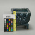 DescriptionAlmost cubic blue-glazed vessel on raised feet. Applique clay tadpole design on front.