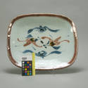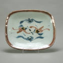 DescriptionOblong platter with rounded corners & blue underglaze (crackle). Dark blue and brown abstract design in centre & .675" brown edge around platter. Unglazed foot of 8" underneath.