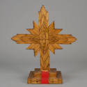 DescriptionCross of wood covered with match sticks atop match-stick covered stepped pedestal. Red felt runner covers path from bottom of stairs to front and back of cross. Arrow shaped rays project diagonally from center of cross. Small match-stick cross also projects slightly from center of cross.Artist not recorded