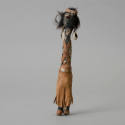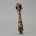 Carved, painted wood, cut, glued leather; guaze-wrapped fiber, carved wood body painted black; gauze painted black, wrapped around legs; brown leather loincloth with straps glued to body; black fiber hair with leather headband; white...