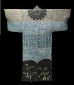 DescriptionThin cotton robe, indigo and white, chrysanthemum on back, ferns on bottom, and stencil designs in bands across middle. Top stencil design is karahana kikko--floral hexagon. See notes below. Fragile19th century