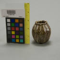 Brown and white striped design, fluted rim. Design formed by combining two kinds of clay. Jar is teased into shape so as not to destroy the design.