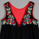 DescriptionThis black wool dress has a bodice heavily embroidered in red, blue, greens, and yellow wool. The bodice is lined in red cotton and edged in red commercial braid. The hem has a simliar panel edged in red. There are snaps for attaching the apron. There is a hook and eye closure.20th century