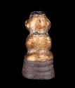 DescriptionSmall figure of a boy sitting cross-legged on platform base. Red, black, and gold pigment.