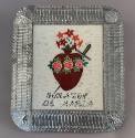 DescriptionReverse glass painting of a sacred heart, with a wreath of red and pink roses around the shoulder, pierced by a sword. Centered above is a small bouquet of five petalled flowers in oranges and deep rose reds. Corazón de María is painted in script below the heart, under a scratch painted white background.late 19th-early 20th Century