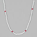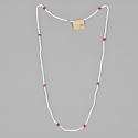 DescriptionLong white beaded necklace, with eight groups of two red beads spaced evenly among them.