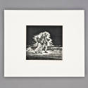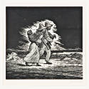 DescriptionBlack and white print of wood engraved image of two figures, the woman is carrying a child on her back and the man is holding a turkey, the sky in the background is black.