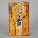 Descriptionpainting on wood of a saint holding a plam leaf and mostrance. Yellow background, red-orange curtains.