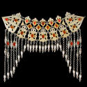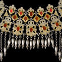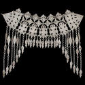 DescriptionThis silver belt has brass inlays and cutwork. At the top is a metal chain flollowed by three attached rows, all with inset ovals of red glass. From the main section, on chains, hang different lengths of tear drop shapes. On longer sections are decorated metal ovals similar to the red glass.Artist not recorded