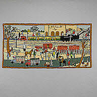 The Train Station, 1979. This gabba, chain-stitched embroidery on felted wool, illustrates the forced migration of Kahuta residents after the area became a site for the national atomic bomb project in 1976. Unknown artist, Pakistan. MOIFA, IFAF Collection, FA.1985.464.13.