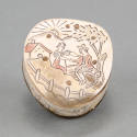 DescriptionLid: sunrise over mountain, house with seated couple under tree. Bottom: foliage with two birds. Houses, mountains, running animal (fox?), stylized flowers. All polychromed with red and yellow. (Innsbruck, Austria, 1929).