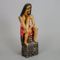 DescriptionPensive Christ figure, black hair, red skirt with silver dots, brown painted base with silver dots.